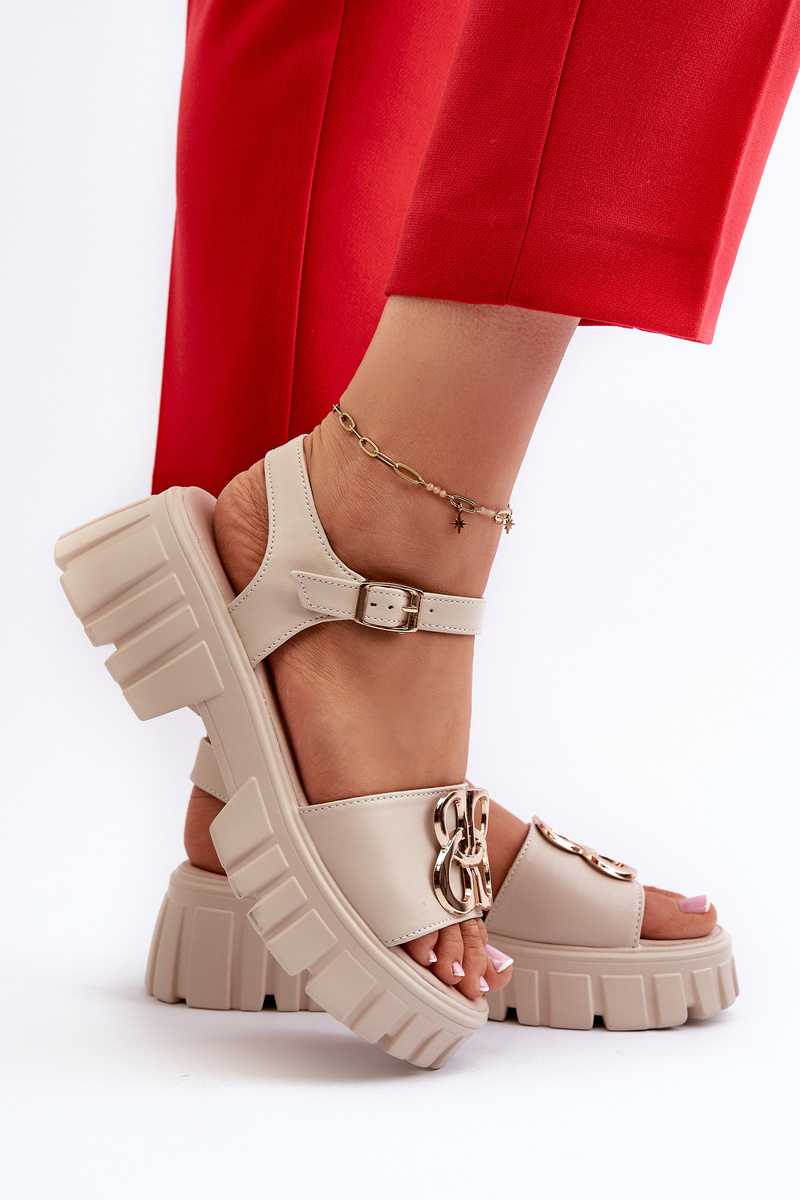 Podczas długich, letnich spacerów wygoda oraz elegancja są ważnymi elementami w doborze obuwia, dlatego najlepszym rozwiązaniem będą sandałki. Kobiety uwielbiają je za to, że nadają stylizacjom delikatności oraz zapewniają stopom pełen komfort. Wykonane ze skóry naturalnej. Osadzone na platformie i masywnym, płaskim obcasie. Zapinane na regulowany pasek ze sprzączką. Z przodu złota ozdoba.