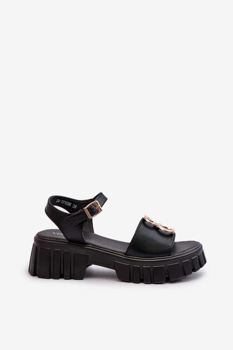 Podczas długich, letnich spacerów wygoda oraz elegancja są ważnymi elementami w doborze obuwia, dlatego najlepszym rozwiązaniem będą sandałki. Kobiety uwielbiają je za to, że nadają stylizacjom delikatności oraz zapewniają stopom pełen komfort. Wykonane ze skóry naturalnej. Osadzone na platformie i masywnym, płaskim obcasie. Zapinane na regulowany pasek ze sprzączką. Z przodu złota ozdoba.