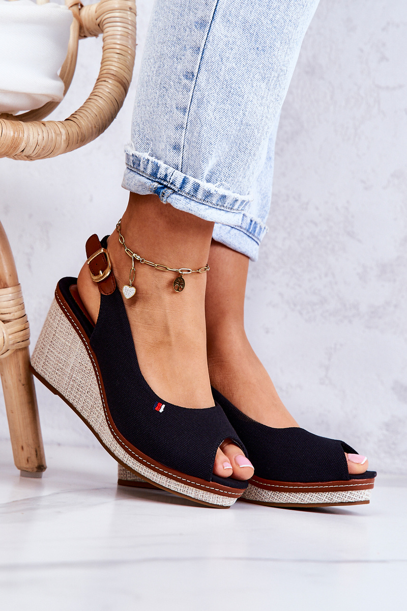 Sandały Damskie Wygodne Sprzączka Obcas Koturn Czarne Thallas