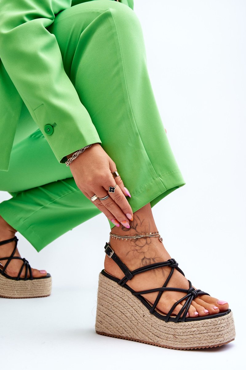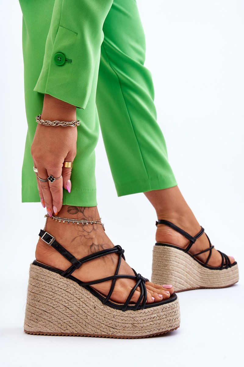Sandały Modne Koturn Plecionka Czarne Nessia