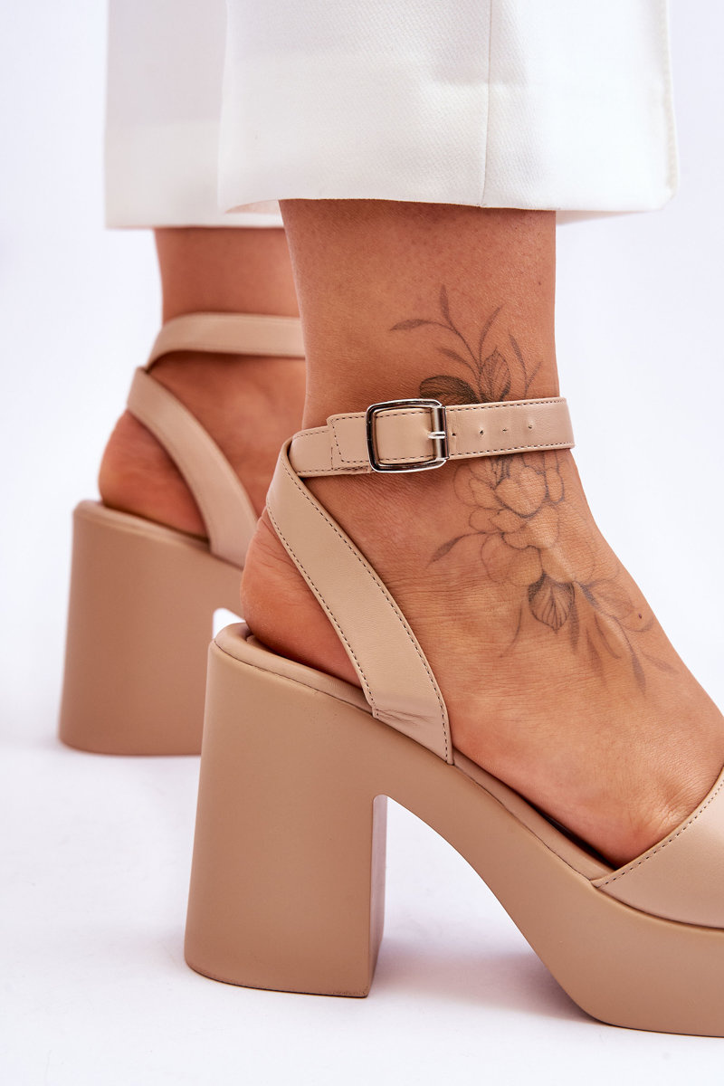 Sandałki na obcasie świetnie sprawdzą się podczas wielu stylizacji z sukienkami lub eleganckimi spodniami w roli głównej. Dzięki obcasowi nogi wyglądają na bardziej smukłe. Koniecznie musisz je mieć! Wykonane z eko skóry. Sandałki posiadają zapinanie na regulowany pasek ze sprzączką. Buty te osadzono na masywnym obcasie w formie szerokiego słupka oraz platformie. Model ten posiada odkryty nosek i piętę, natomiast na przodzie znajduje się szerszy pasek. Sandałki posiadają wygodną, eko skórzaną wkładkę.