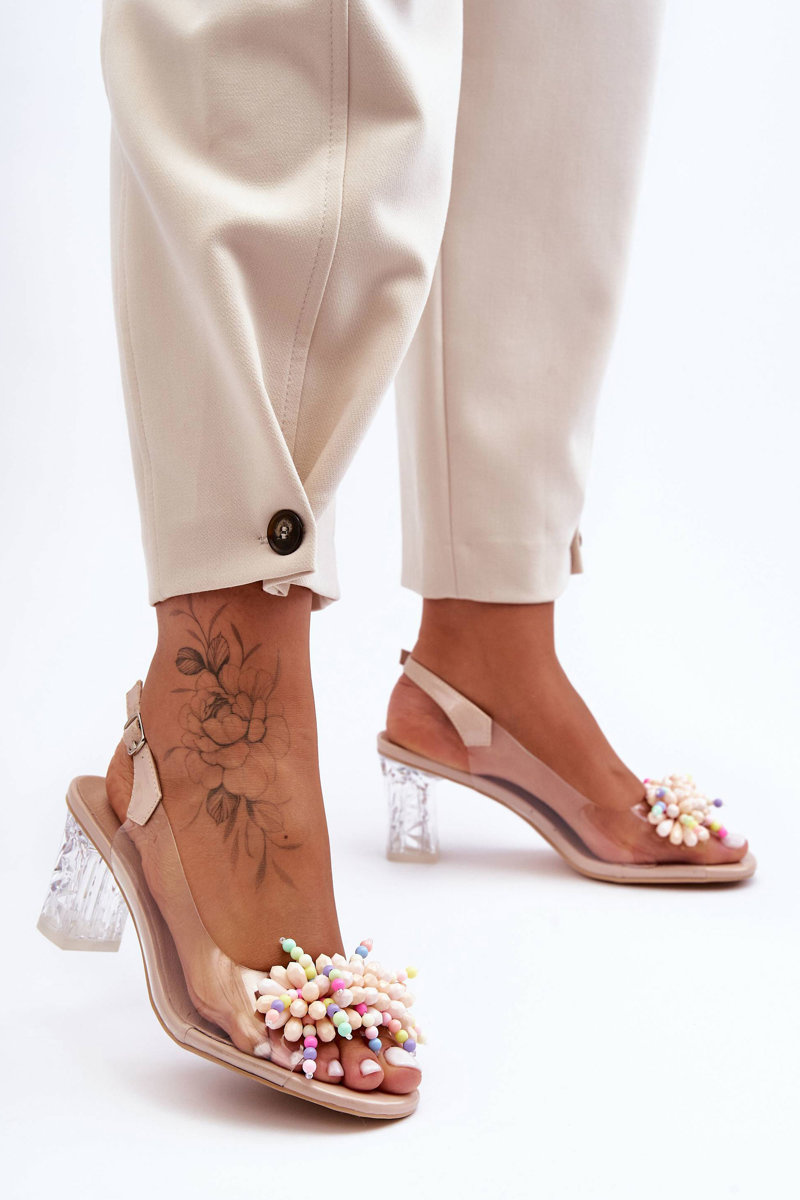 Sandałki na obcasie świetnie sprawdzą się podczas wielu stylizacji z sukienkami lub eleganckimi spodniami w roli głównej. Dzięki obcasowi nogi wyglądają na bardziej smukłe. Koniecznie musisz je mieć! Wykonane z połączenia eko skóry oraz tworzywa sztucznego. Posiadają zapinanie wokół kostki na klamrę z regulowanym paskiem. Zdobione licznymi koralikami z przodu. Miękka wkładka została wykonana z naturalnej skóry i jest niezwykle komfortowa w użytkowaniu.
