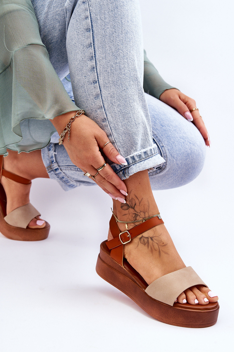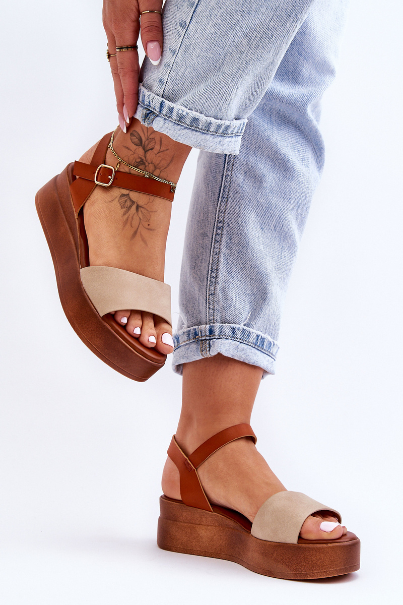 Sandały Wygodne Skóra Koturn Beżowo-Brązowe Tifena 55-209
