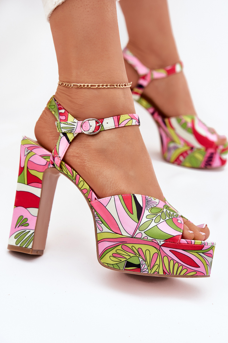 Sandały Wzorzyste Materiałowe Słupek Platforma Różowo-Zielone Slaria