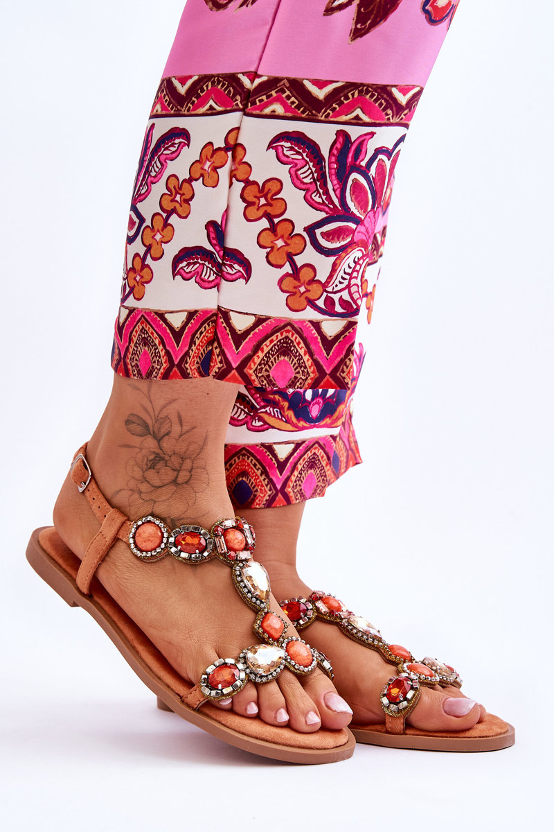 Sandały Zamsz Płaskie Kamienie Pomarańczowe Dallas