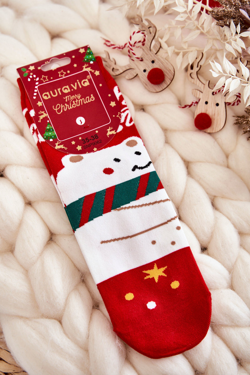 Skarpety Damskie Świąteczny Wzór W Misia Czerwone