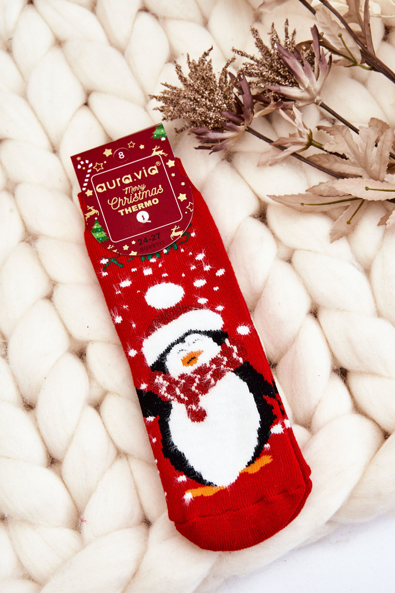 Skarpety Dziecięce Świąteczne Bawełniane Termoaktywne Pingwin Czerwone