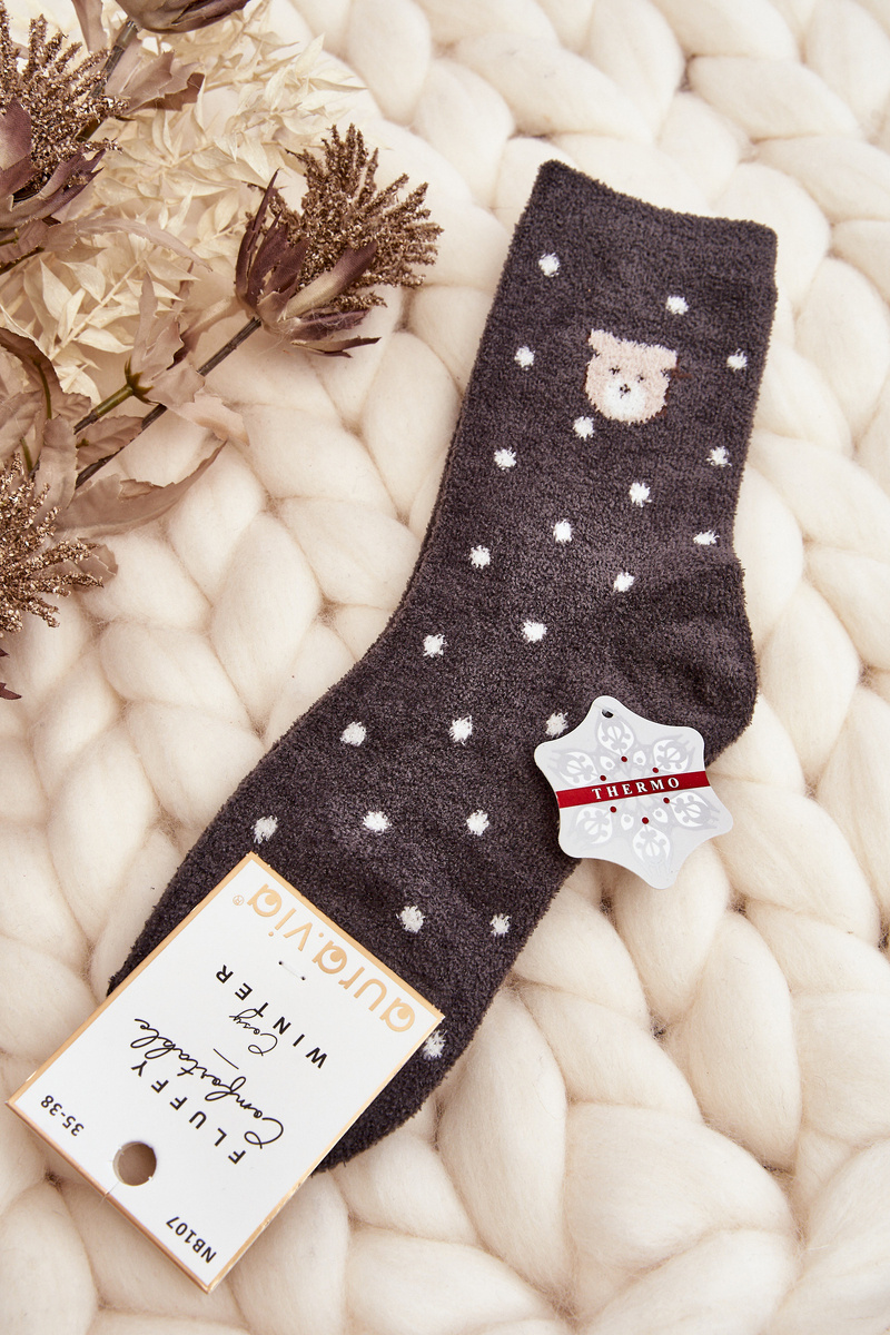 Skarpety W Kropki Damskie Ciepłe Z Misiem Ciemnoszare NB107