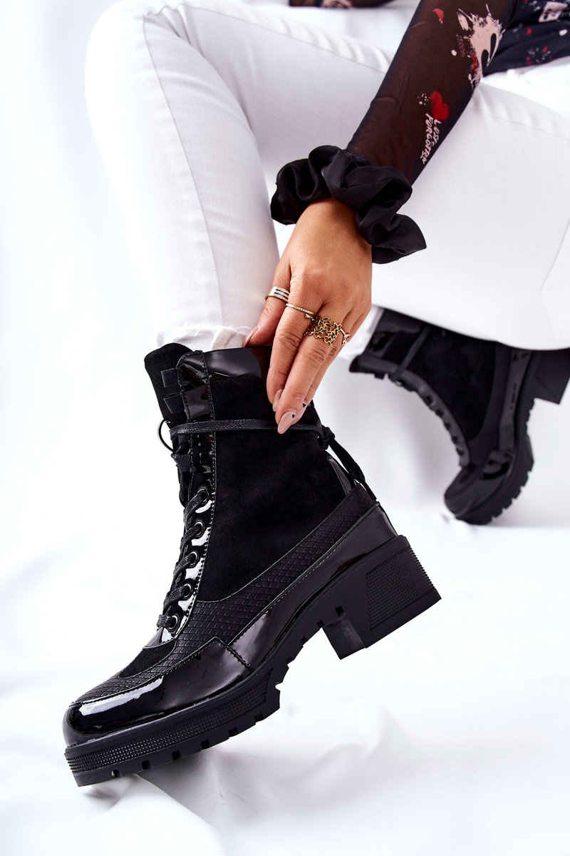 Botki wykonane z eko skóry, natomiast na górze cholewki oraz przy podeszwie są wykonane z lakierowanej eko skóry. Posiadają wiązanie. Delikatny obcas w postaci słupka subtelnie uniesie sylwetkę. Świetny model, który doda Twoim stylizacjom charakteru! Musisz je mieć! Przy wyborze rozmiaru prosimy sugerować się tabelą rozmiarów.