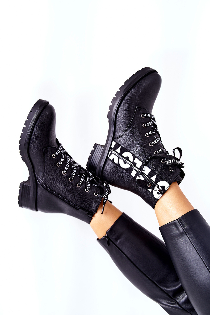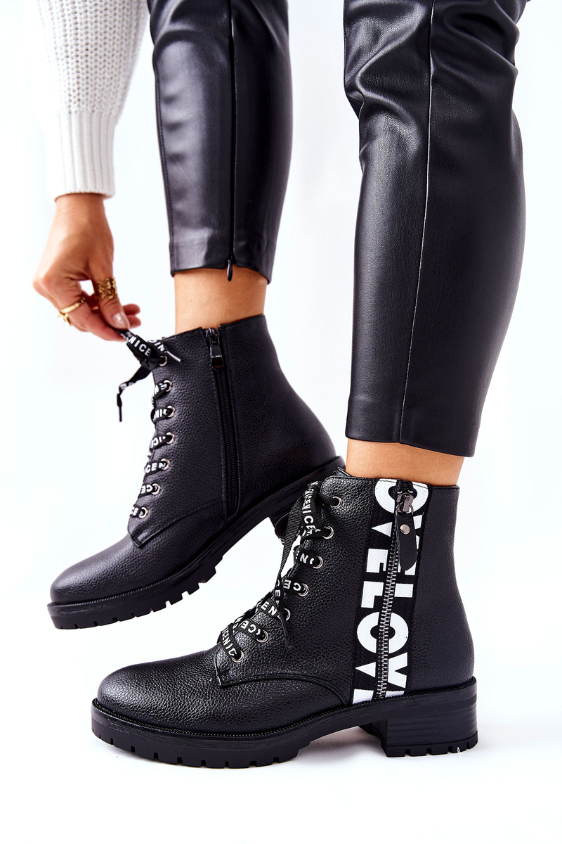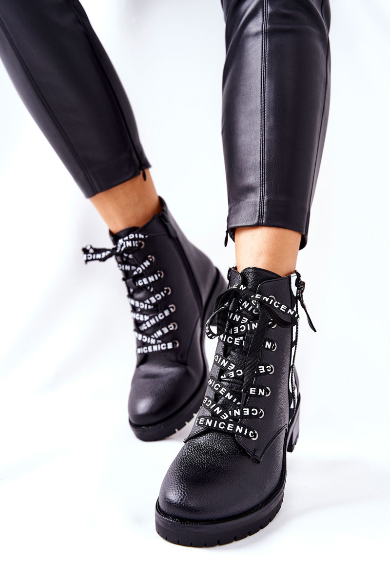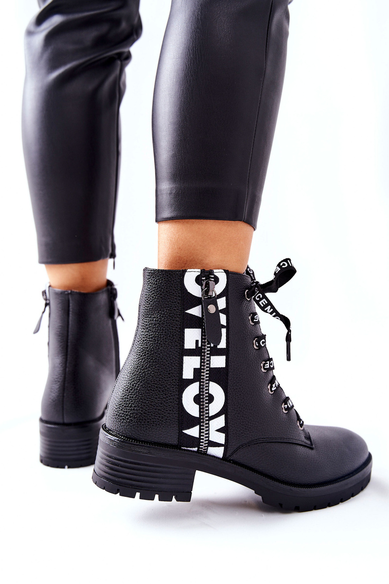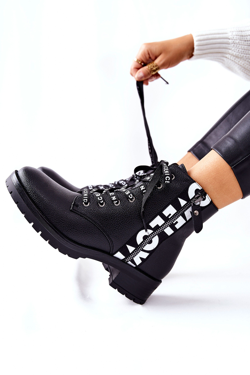 Piękne botki workery zostały wykonane z zewnątrz z eko skóry, natomiast w środku z materiału tekstylnego. Posiadają dwa suwaki, choć jeden z nich jest elementem ozdobnym. Ciekawy wzór na sznurówkach oraz z boku cholewki sprawia, że są naprawdę wyjątkowe. Workery są ocieplone kocem obuwniczym oraz posiadają miękką wkładkę. Przy wyborze rozmiaru prosimy sugerować się tabelą rozmiarów.