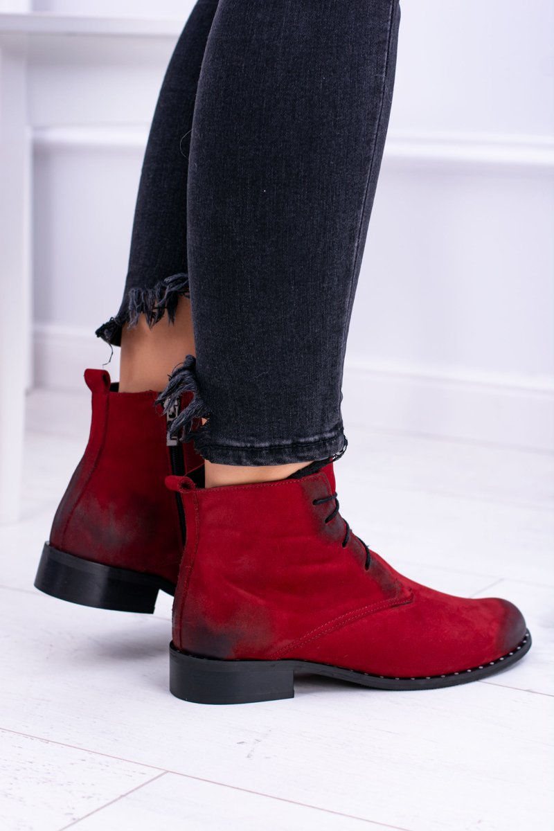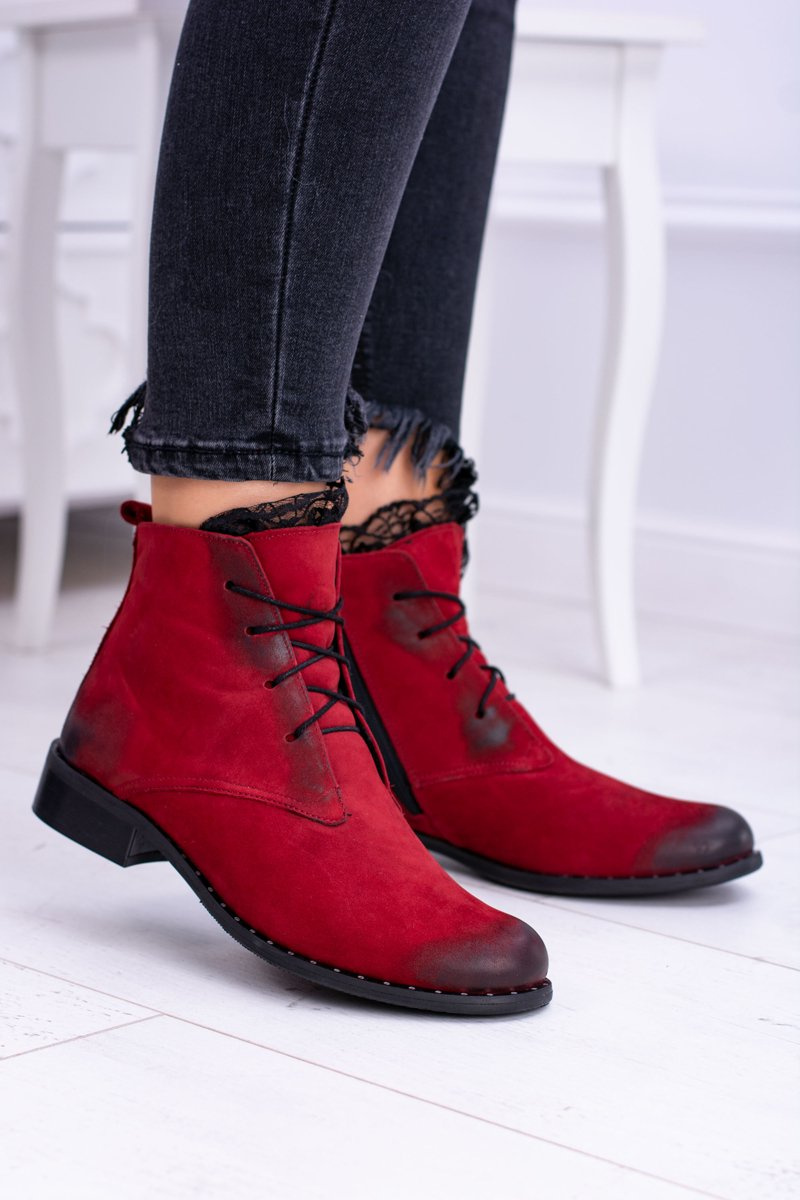 Skórzane Czerwone Damskie Botki Z Koronką Millano