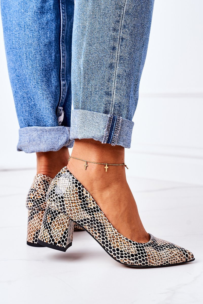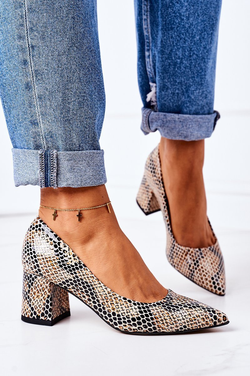 Skórzane Czółenka Ze Zwierzęcym Wzorem Lewski Shoes 2801 Czarno-Beżowe