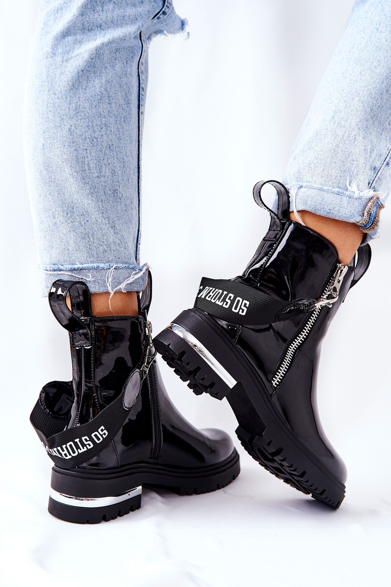 Skórzane Lakierowane Botki Z Suwakiem Czarne Cortona