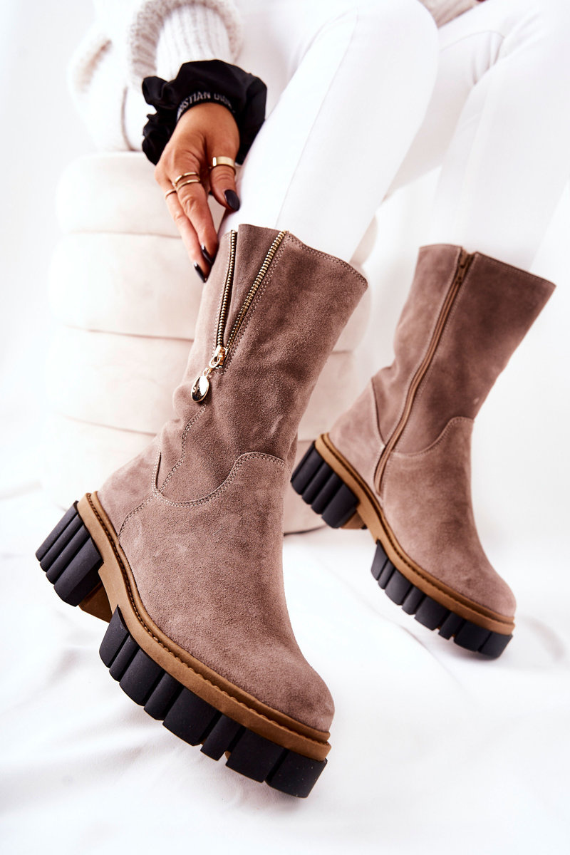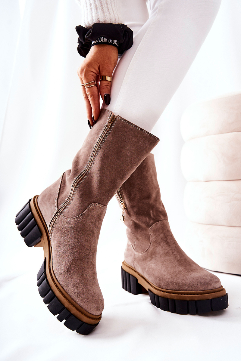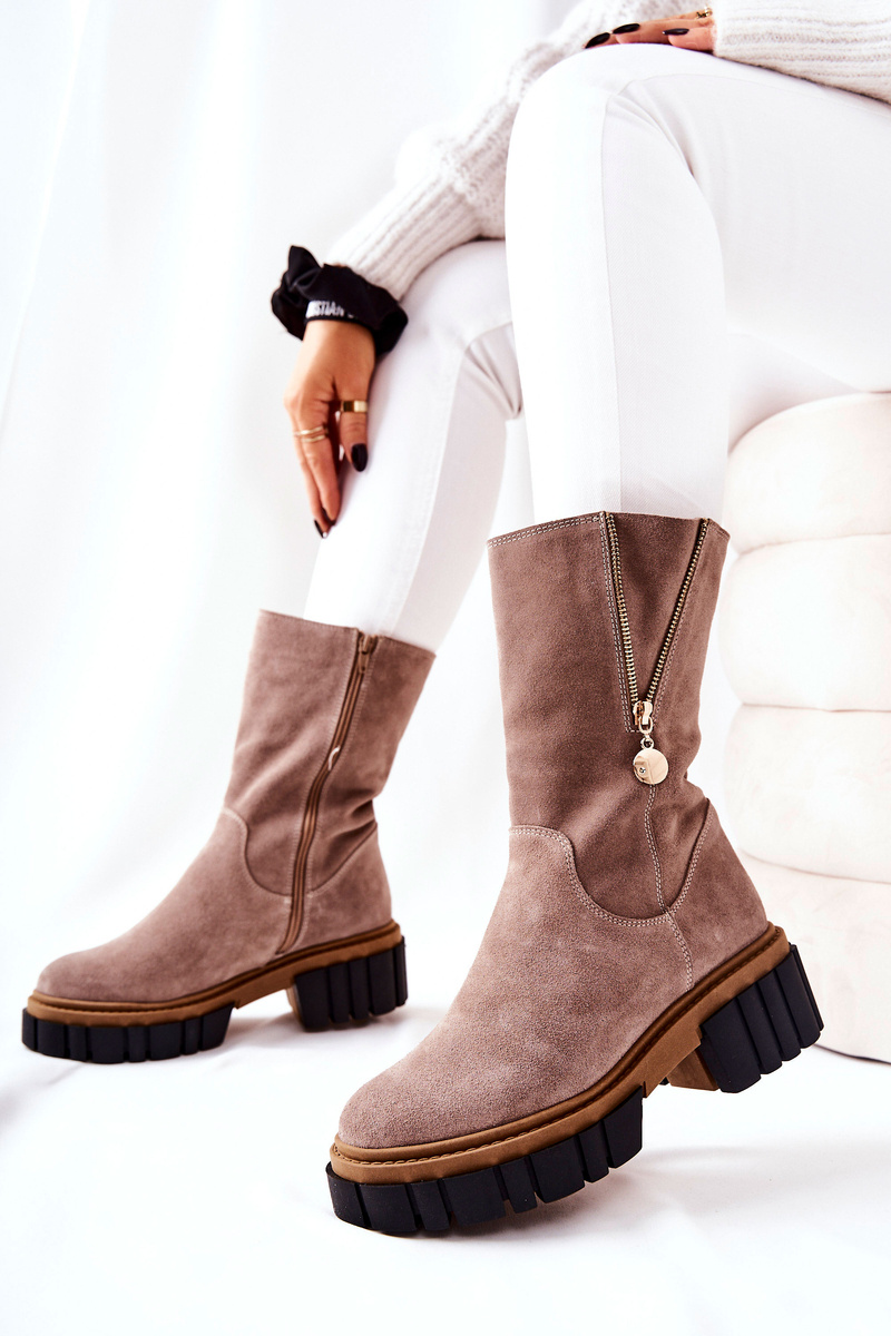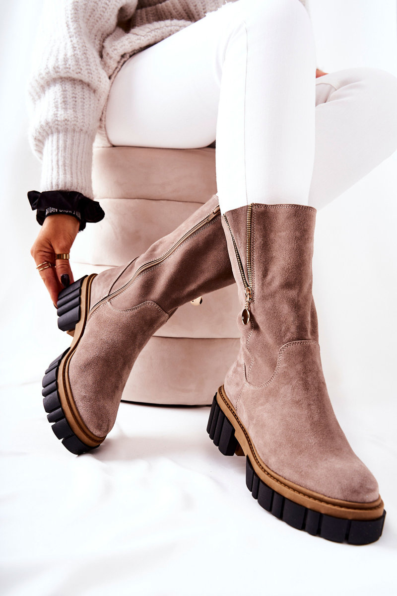 Skórzane Ocieplane Botki Kozaki Cappucino Souffle