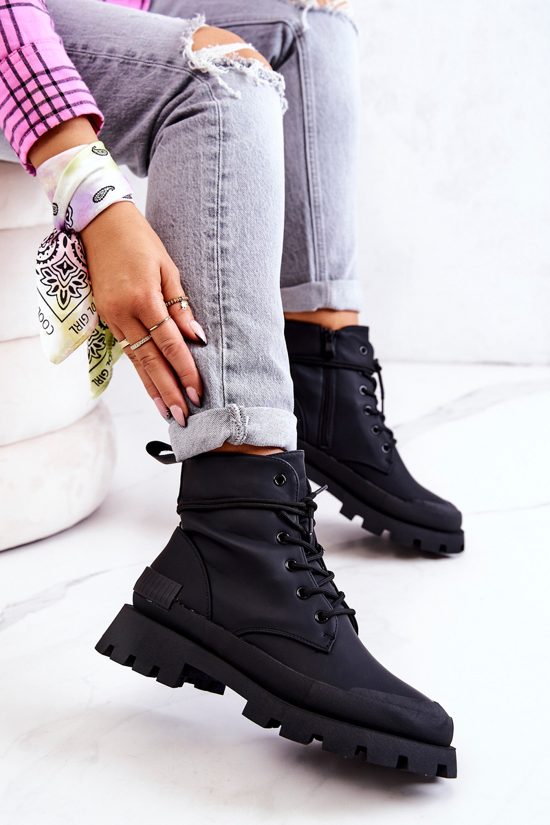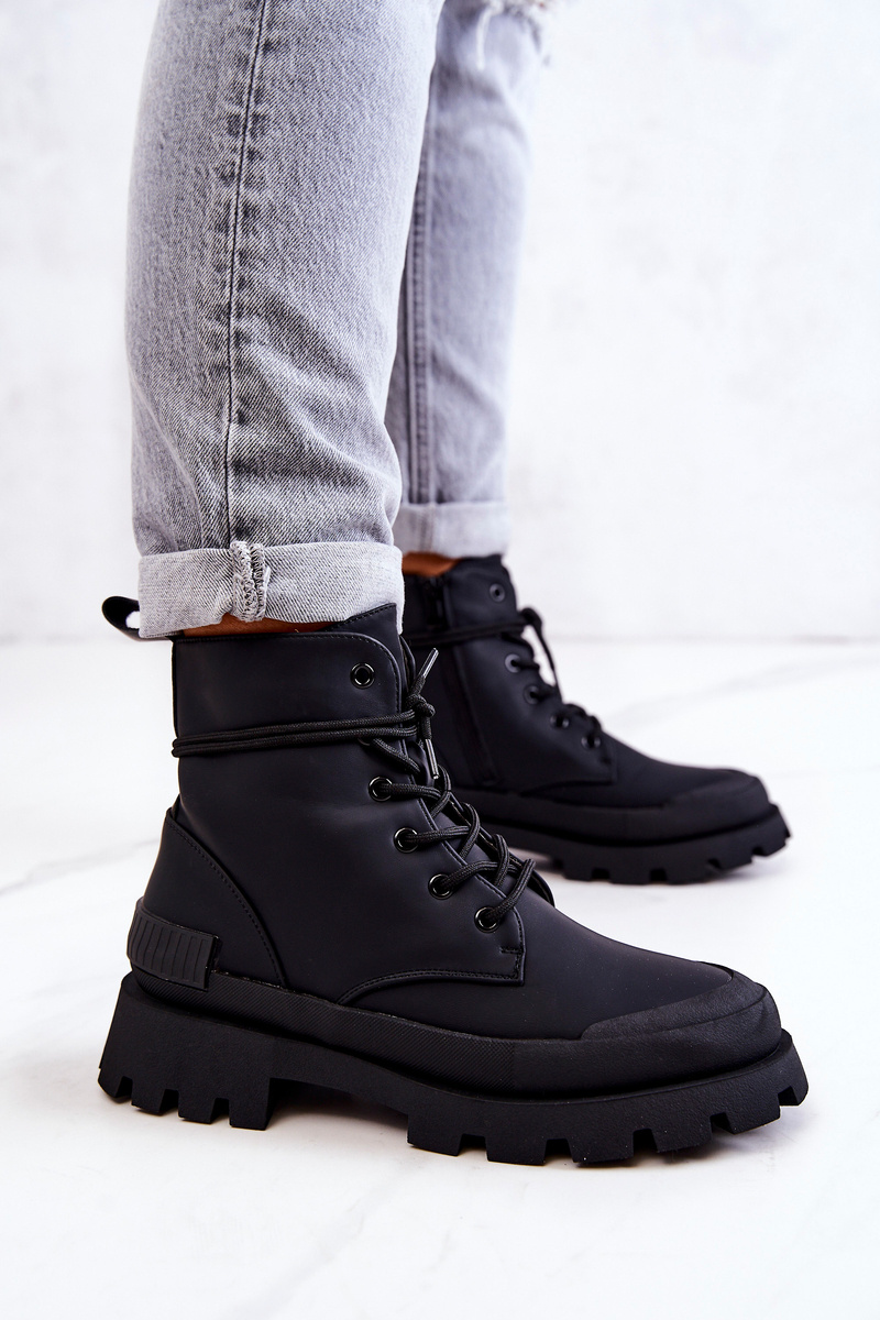Skórzane Ocieplane Botki Trapery Wiązane Czarne Racquell