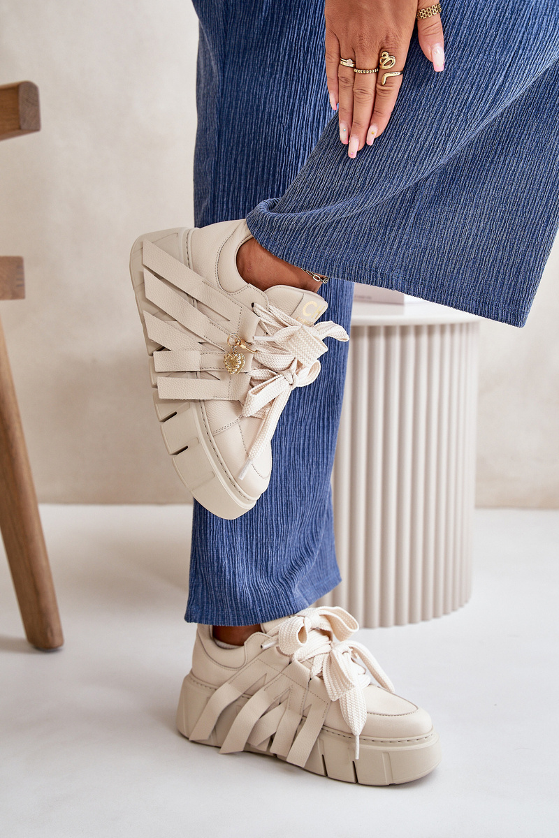 Skórzane Sneakersy Damskie Na Platformie CheBello 4568 Beżowe
