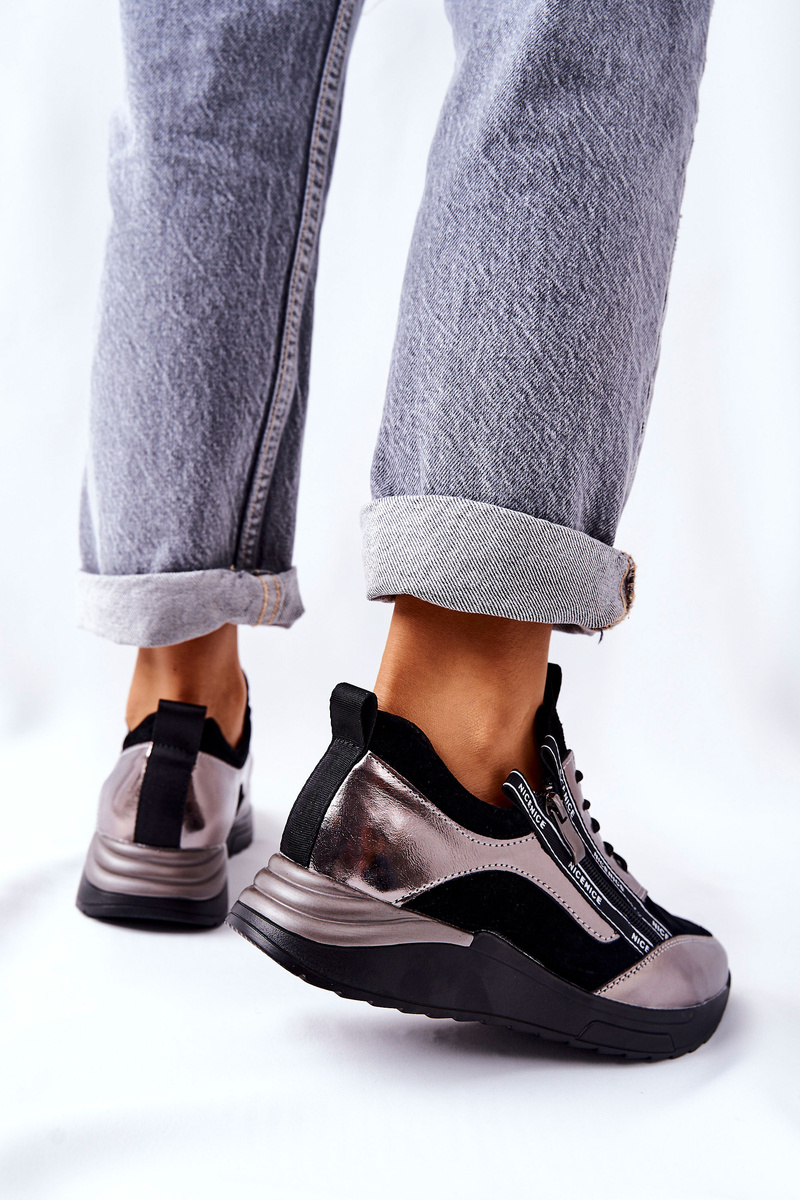 Modne skórzane sportowe buty. Posiadają ozdobny suwak oraz wiązanie. Wkładka wykonana z naturalnej skóry. Buty posiadają wysoką podeszwę. Nosek w kształcie migdała, który jest delikatnie uniesiony. Sprawdź całą naszą ofertę butów sportowych !Przy wyborze rozmiaru prosimy kierować się tabelą rozmiarów.