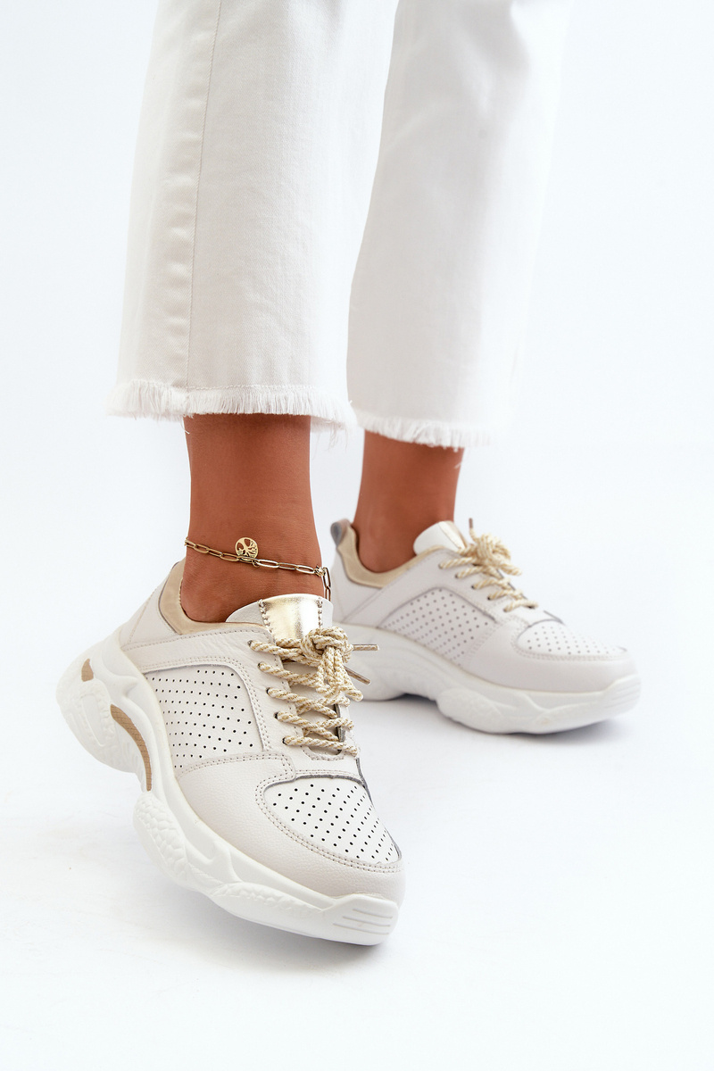 Sneakersy Damskie Skórzane Na Grubej Podeszwie Biało-Złote