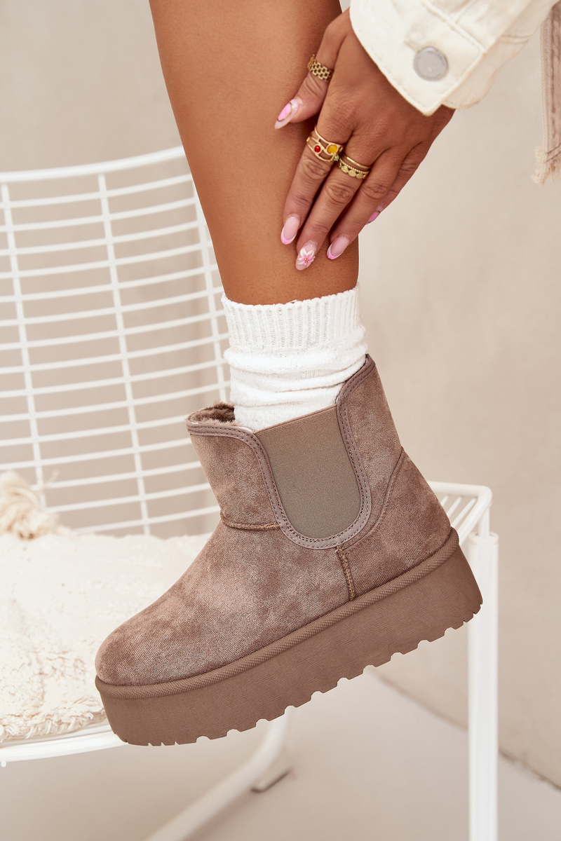 Idealnymi butami na mroźne dni są śniegowce! Cechują się wygodą, a dzięki odpowiednio dobranym materiałom są odporne na mróz i zapewniają optymalny komfort termiczny. Modne śniegowce wykonane z eko zamszu. Środek ocieplony grubym futerkiem, co zapewni ciepło w mroźne dni. Osadzone na platformie, która świetnie odizoluje od zimnego podłoża. Model ten wyróżniają elastyczne wstawki po bokach.