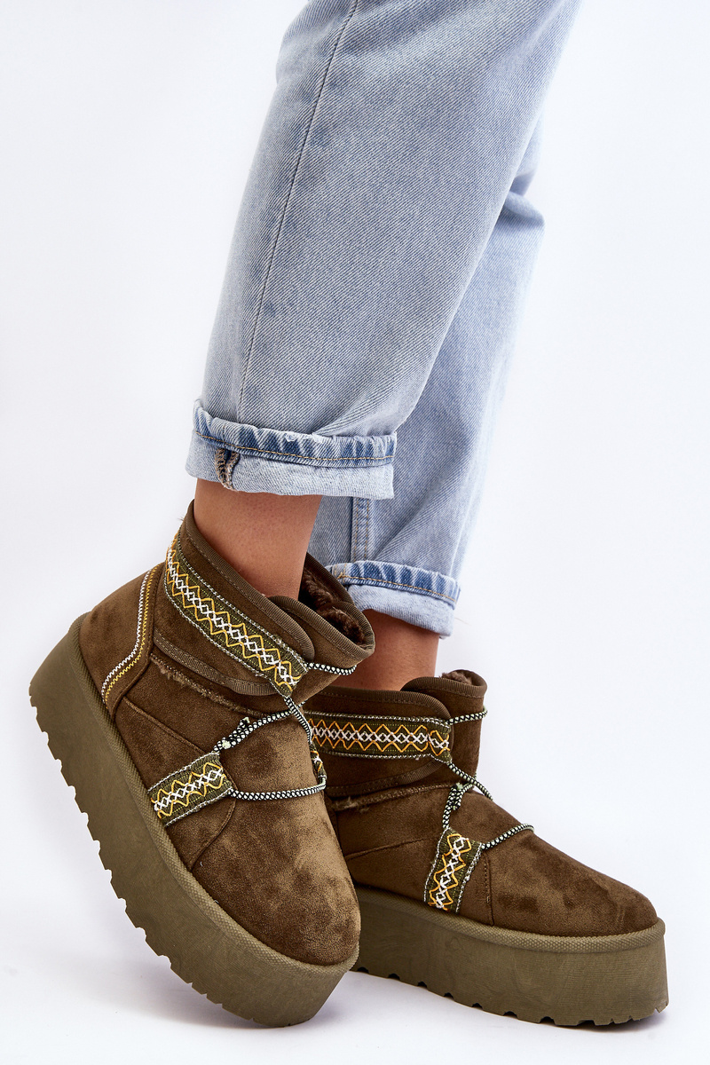 Idealnymi butami na mroźne dni są śniegowce! Cechują się wygodą, a dzięki odpowiednio dobranym materiałom są odporne na mróz i zapewniają optymalny komfort termiczny. Wykonane z eko zamszu. Ocieplone futerkiem. Cholewka za kostkę ozdobiona modnym wzorem i wiązaniem. Model ten osadzony jest na grubej podeszwie z gumowego tworzywa.