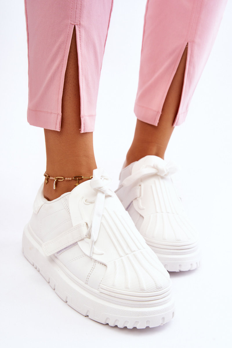 W szafie każdej kobiety powinna znaleźć się para wygodnych butów sportowych. Buty te wyróżniają się wygodą w użytkowaniu oraz wysoką jakością wykonania. Płaska podeszwa na delikatnej platformie świetnie izoluje od podłoża. Wykorzystasz je w wielu sytuacjach – podczas joggingu, spaceru czy spotkania ze znajomymi. Wykonane z połączenia eko skóry oraz gumowego tworzywa. Zapinane na rzep oraz sznurowane.