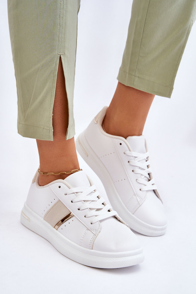 W szafie każdej kobiety powinna znaleźć się para wygodnych butów sportowych. Buty te wyróżniają się wygodą w użytkowaniu oraz wysoką jakością wykonania. Płaska podeszwa na delikatnej platformie świetnie izoluje od podłoża. Wykorzystasz je w wielu sytuacjach – podczas joggingu, spaceru czy spotkania ze znajomymi. Wykonane z eko skóry z ozdobną wstawką z boku cholewki. Model klasycznie sznurowany. Wkładka materiałowa, wyciągana. Podeszwa wykonana z tworzywa sztucznego.