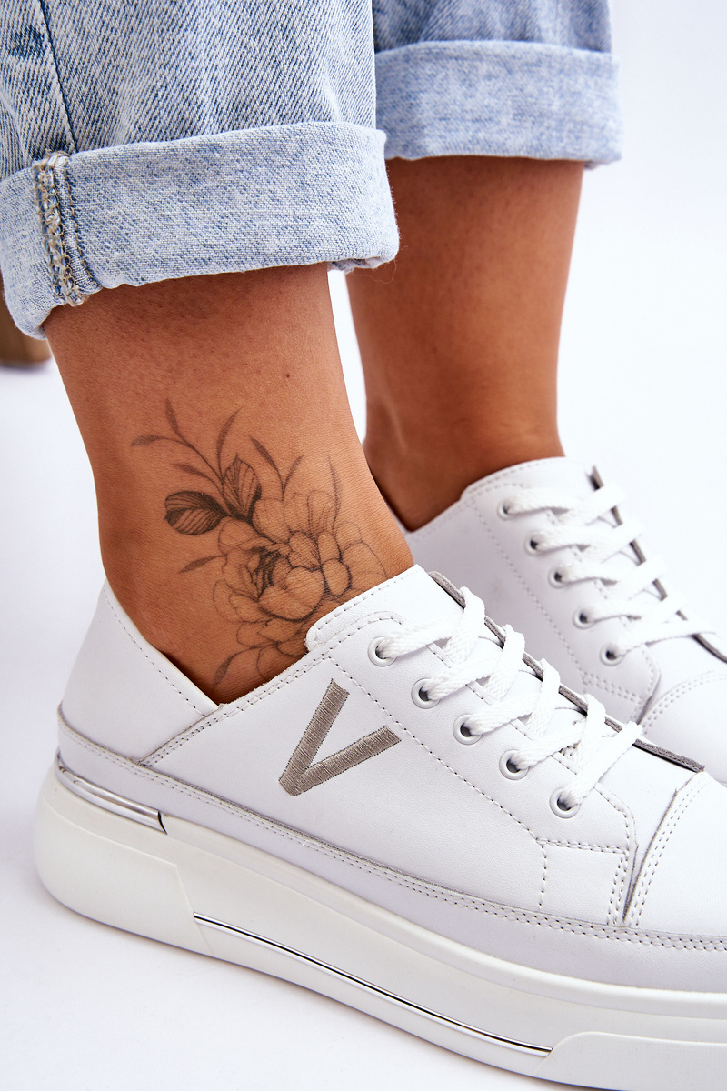 W szafie każdej kobiety powinna znaleźć się para wygodnych butów sportowych. Buty te wyróżniają się wygodą w użytkowaniu oraz wysoką jakością wykonania. Płaska podeszwa na delikatnej platformie świetnie izoluje od podłoża. Wykorzystasz je w wielu sytuacjach – podczas joggingu, spaceru czy spotkania ze znajomymi. Wykonane z naturalnej skóry z ozdobnym, wyszytym logo w kształcie litery „V” na boku cholewki. Model klasycznie sznurowany. Wkładka została wykonana z naturalnej skóry. Podeszwa wykonana z tworzywa sztucznego.