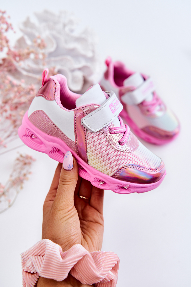 Dziecięce buty sportowe zostały wykonane z solidnych materiałów, dzięki którym są bardzo trwałe. Lekkie i wygodne – to niektóre z cech wyróżniających te obuwie. Stabilna, antypoślizgowa podeszwa gwarantuje komfort noszenia przez cały dzień! Wykonane z połączenia eko skóry oraz materiału tekstylnego z holograficznymi wstawkami. Nosek okrągły. Zapinane na rzep, z gumkami imitującymi sznurówki. Świecąca podeszwa została wykonana z lekkiego, piankowego tworzywa.