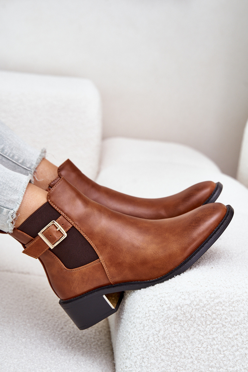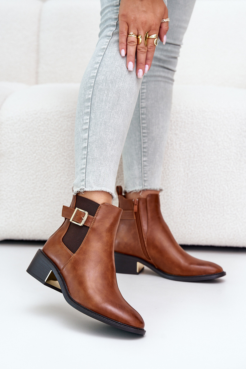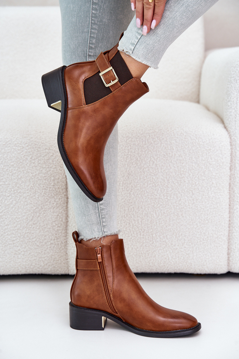Sztyblety Botki Ocieplane Niski Obcas Złota Klamra Camel Vomera
