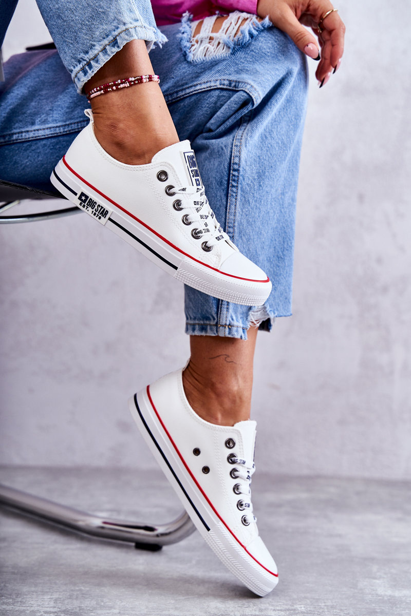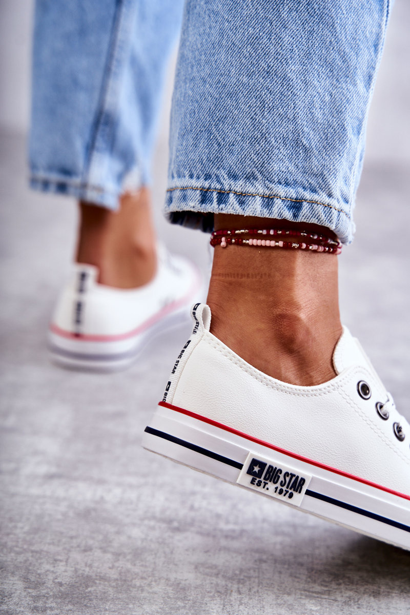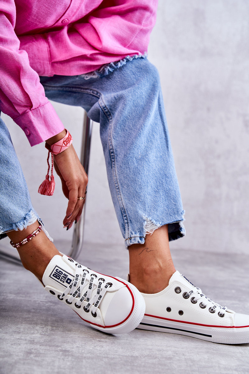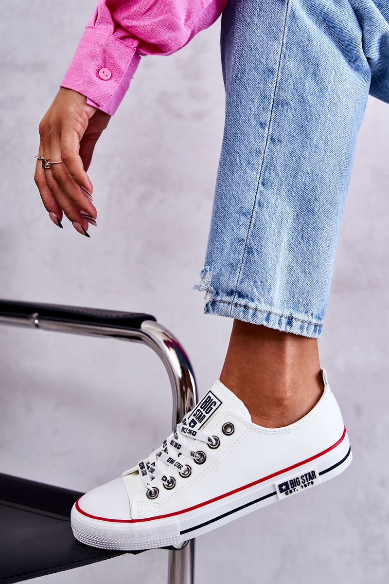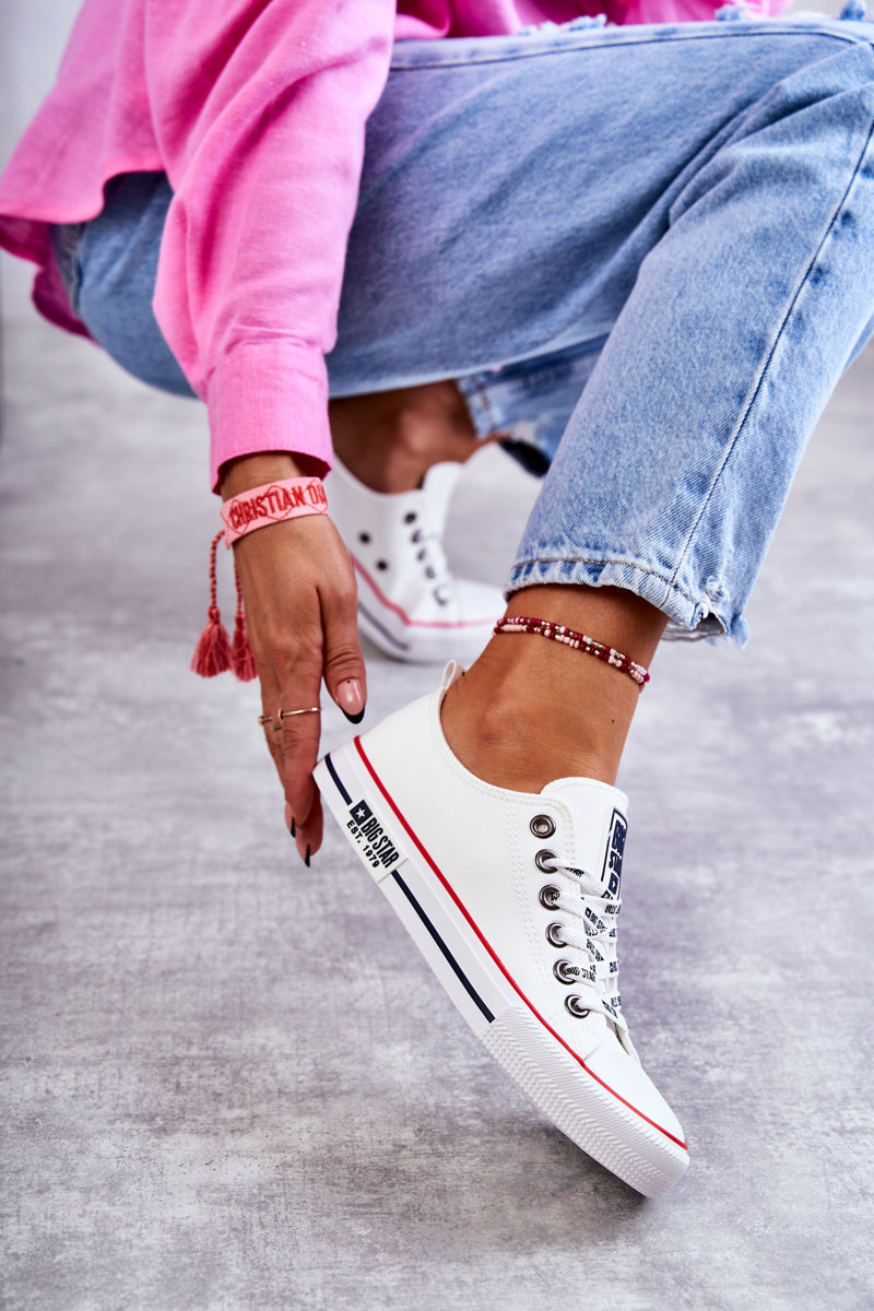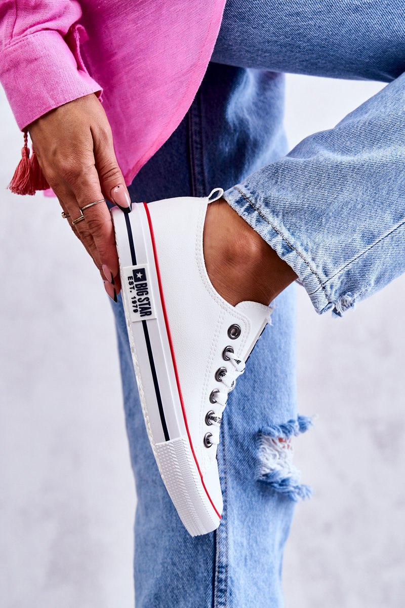 Rewelacyjne trampki damskie Big Star to klasyka gatunku. Wygodne, uniwersalne trampki powinny znaleźć się w szafie każdej kobiety. Możesz zestawić je zarówno ze spodniami, jak i sukienkami czy spódnicami. Wykonane z eko skóry. Posiadają klasyczne wiązanie z logowanymi sznurowadłami. Nosek zaokrąglony, wzmacniany gumowym tworzywem. Podeszwa jest także gumowa, antypoślizgowa. Świetnie sprawdzą się na co dzień!