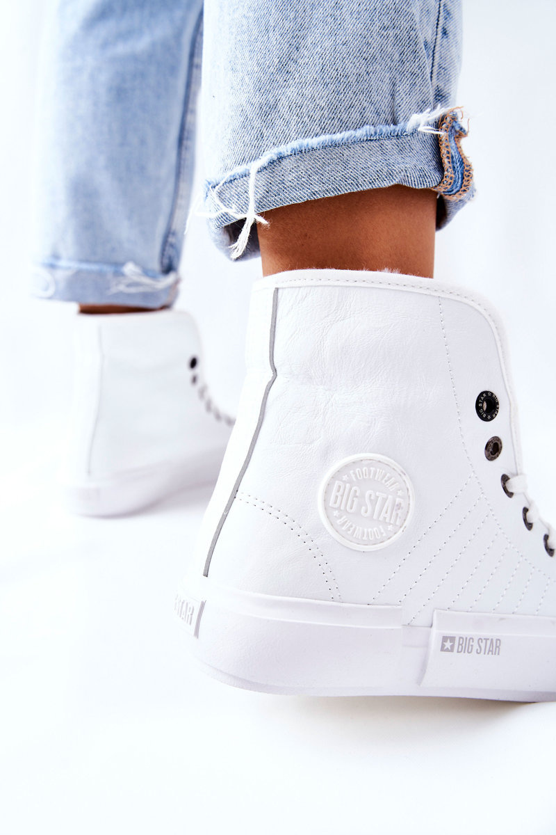Rewelacyjne trampki damskie Big Star to klasyka gatunku. Wygodne, uniwersalne trampki powinny znaleźć się w szafie każdej kobiety. Możesz zestawić je zarówno ze spodniami, jak i sukienkami czy spódnicami. Wykonane z eko skóry. Można je wywinąć. w środku posiadają ocieplenie w postaci delikatnego futerka.