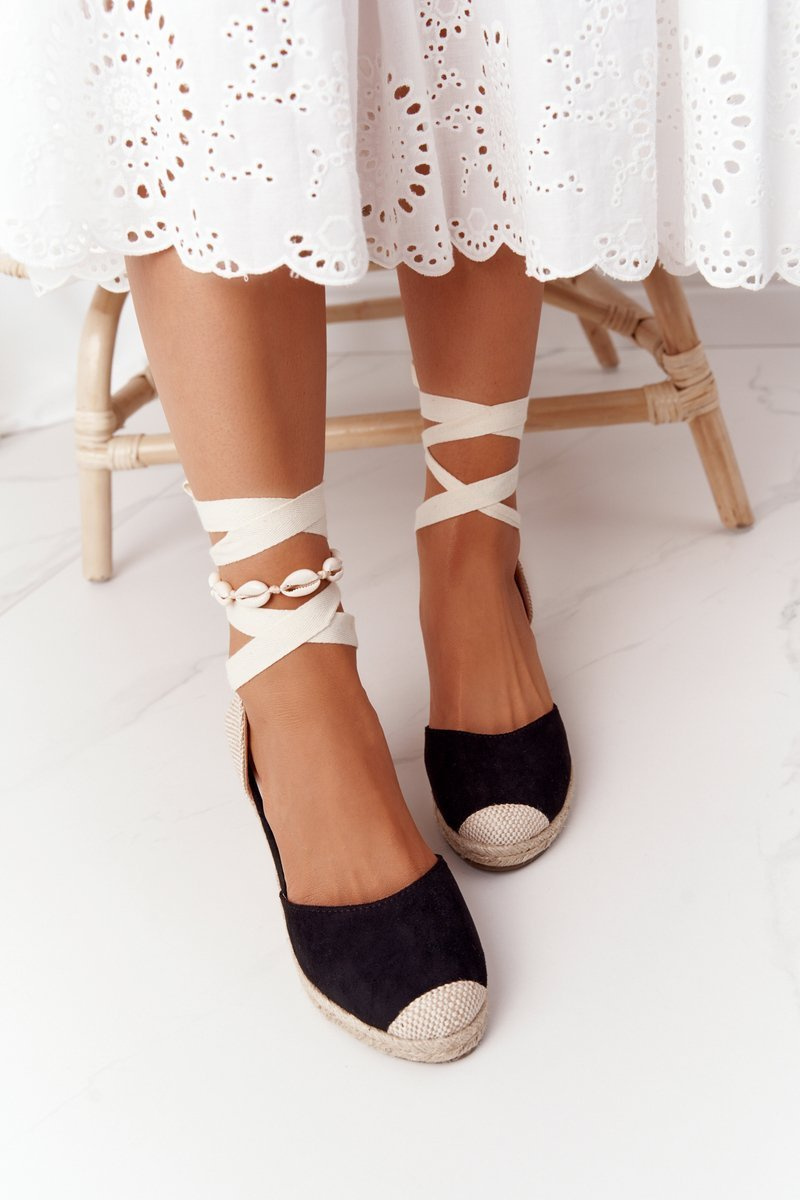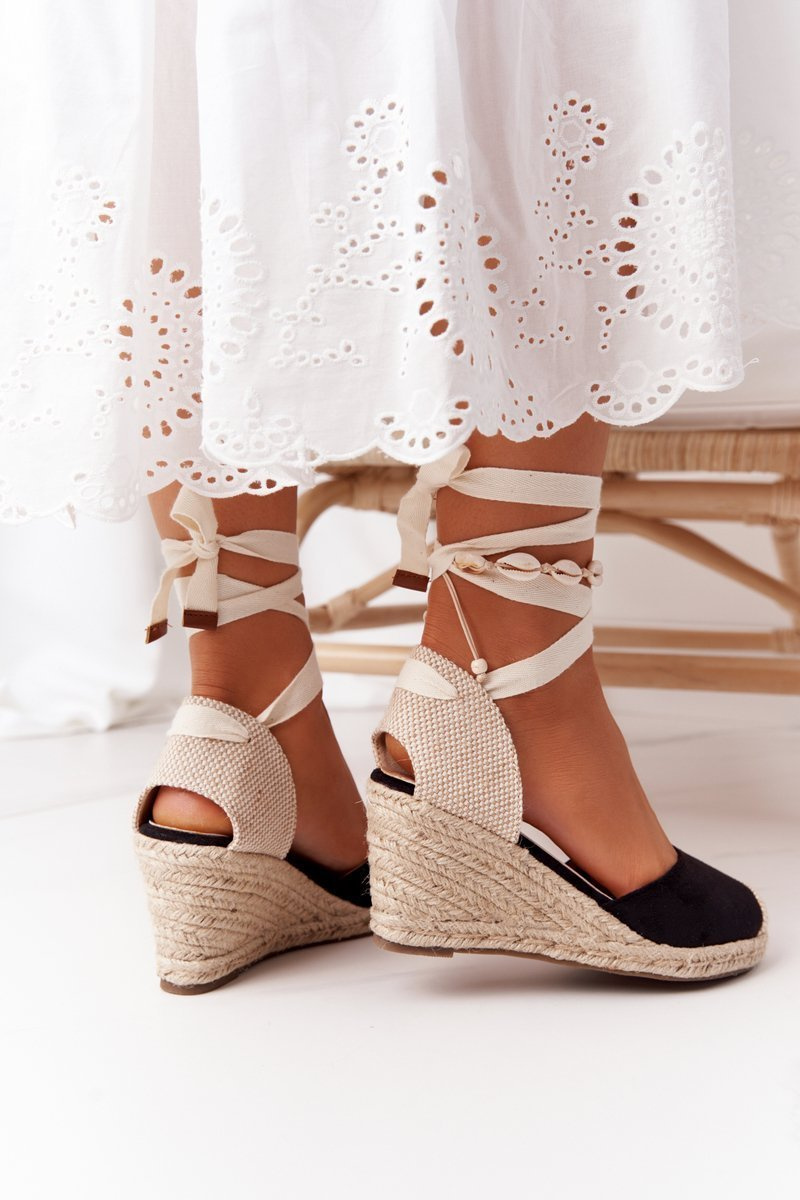 Wiązane Sandały Na Koturnie Z Plecionką Czarne Nelly