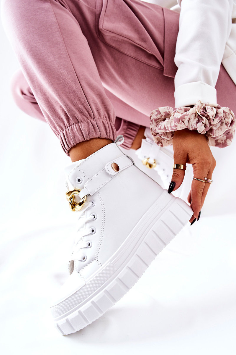 Buty zostały wykonane z eko skóry. Posiadają materiałową wkładkę. Zapinane na suwak oraz wiązane. Wysokie trampki posiadają ozdobny łańcuch na pasku, który jest zapinany na napę. Można go także całkowicie zdjąć. Buty posiadają wysoką, stabilną platformę. Koniecznie sprawdź także pozostałą naszą ofertę trampek na platformie! Przy wyborze rozmiaru prosimy sugerować się tabelą rozmiarów.