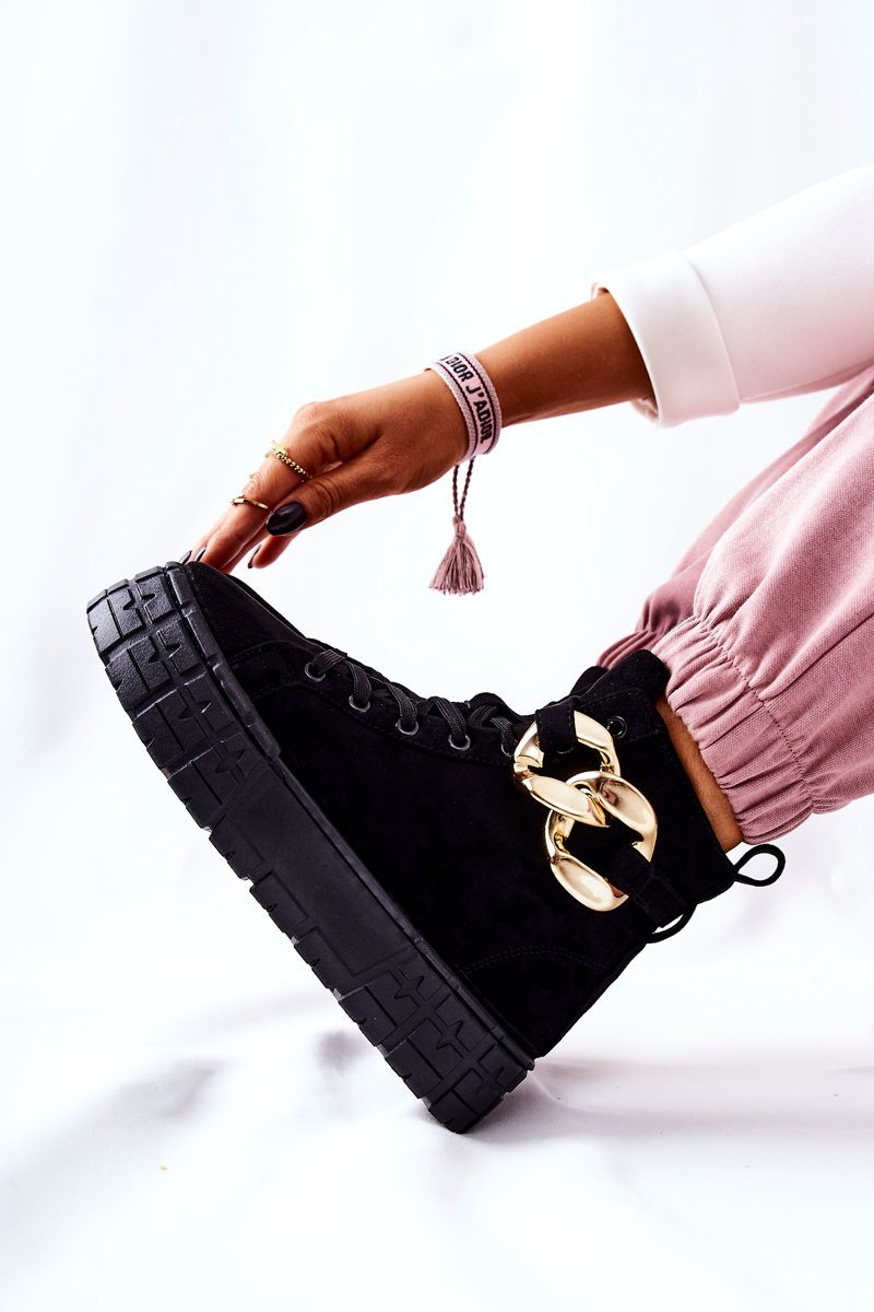 Buty zostały wykonane z zamszowej eko skóry. Wysokie trampki posiadają ozdobny łańcuch na pasku, który jest zapinany na sprzączkę. Można go także całkowicie zdjąć. Buty posiadają wysoką, stabilną platformę. Wśrodku znajduje się materiałowa wkładka. Koniecznie sprawdź także pozostałą naszą ofertę trampek na platformie! Przy wyborze rozmiaru prosimy sugerować się tabelą rozmiarów.