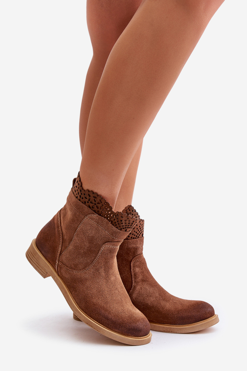 Uwielbianym i najczęściej wybieranym modelem przez kobiety są botki na płaskim, stabilnym obcasie. Posiadają wiele atutów, jednak głównym z nich jest zapewnienie wysokiego komfortu podczas noszenia. Wykonane z naturalnego zamszu. Zapinane na zamek. Cholewka sięgająca za kostkę ozdobiona ażurowym elementem. Noski zaokrąglone. Usztywniony zapiętek.