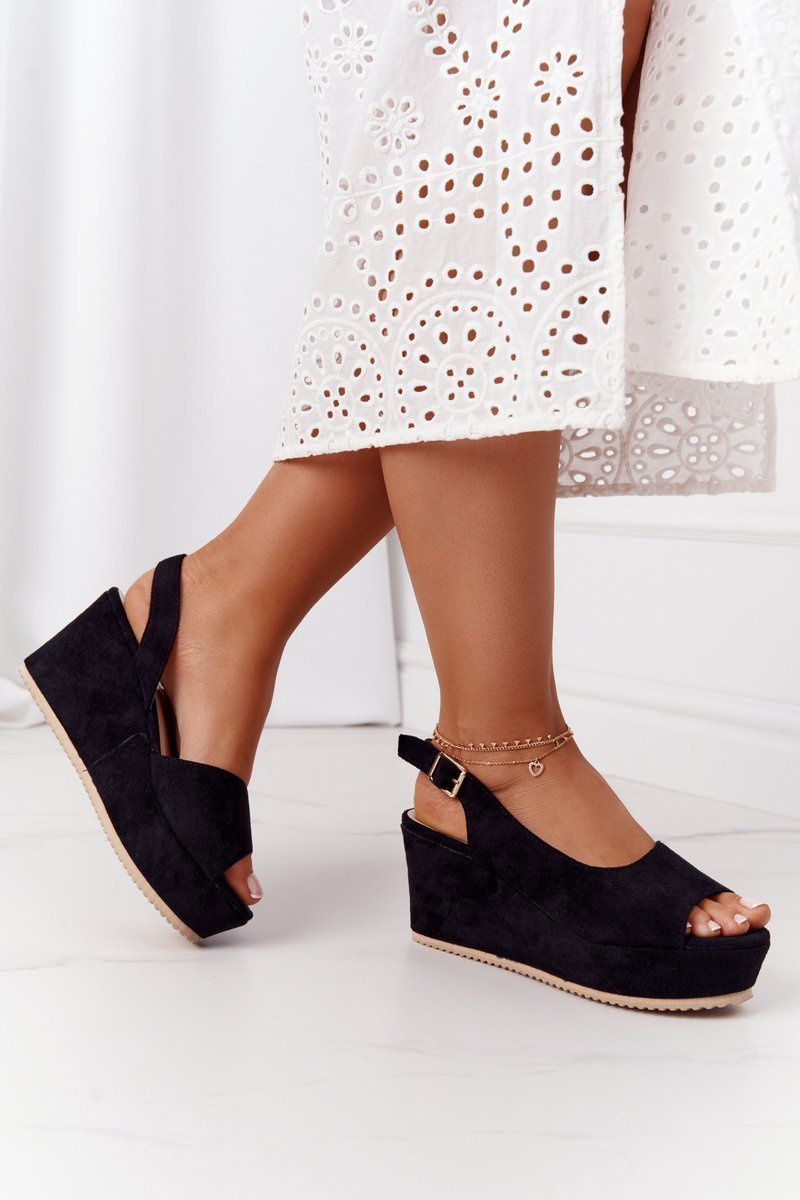 Zamszowe Sandały Na Koturnie Czarne Party Time