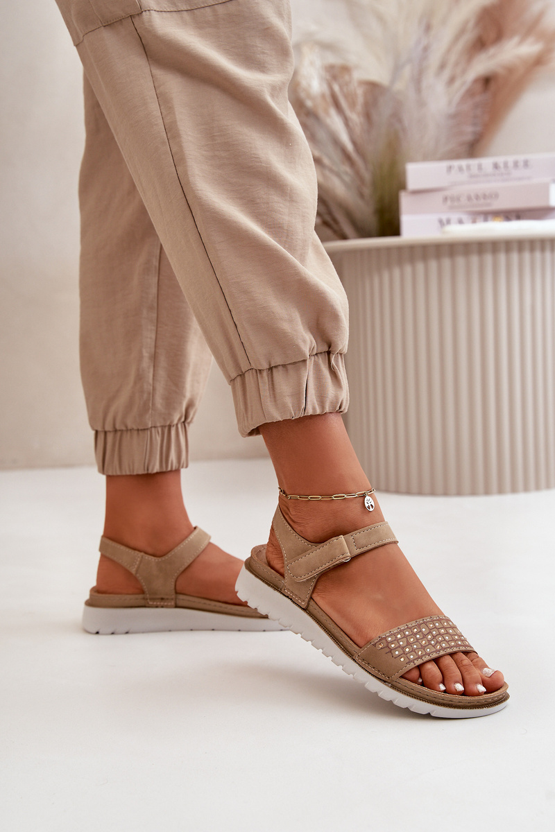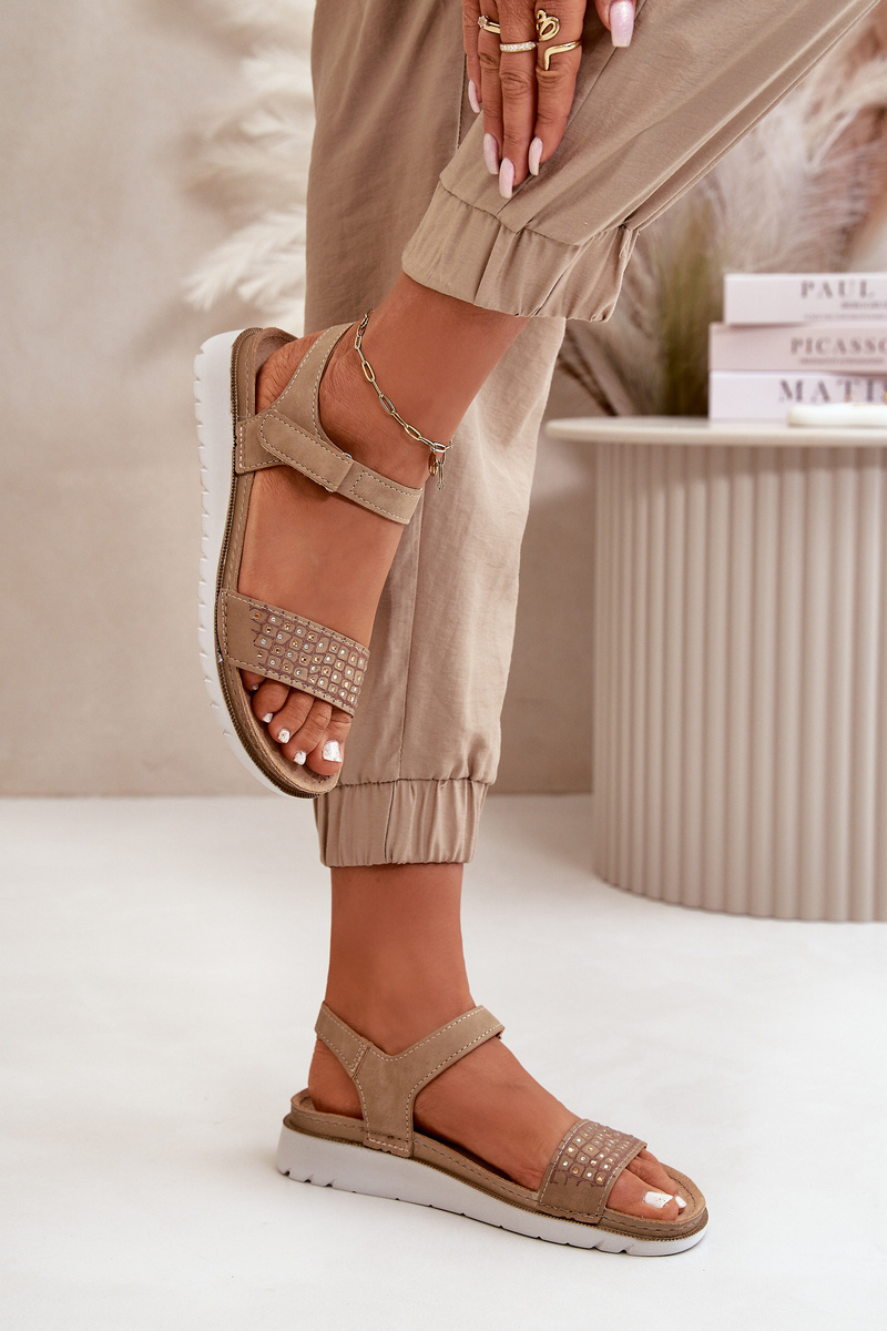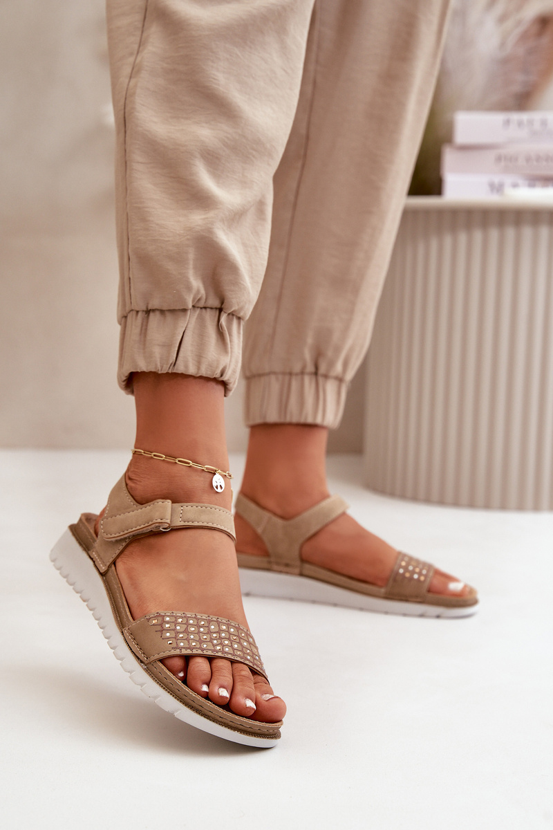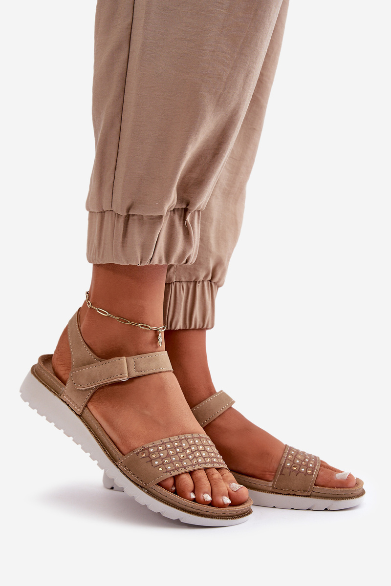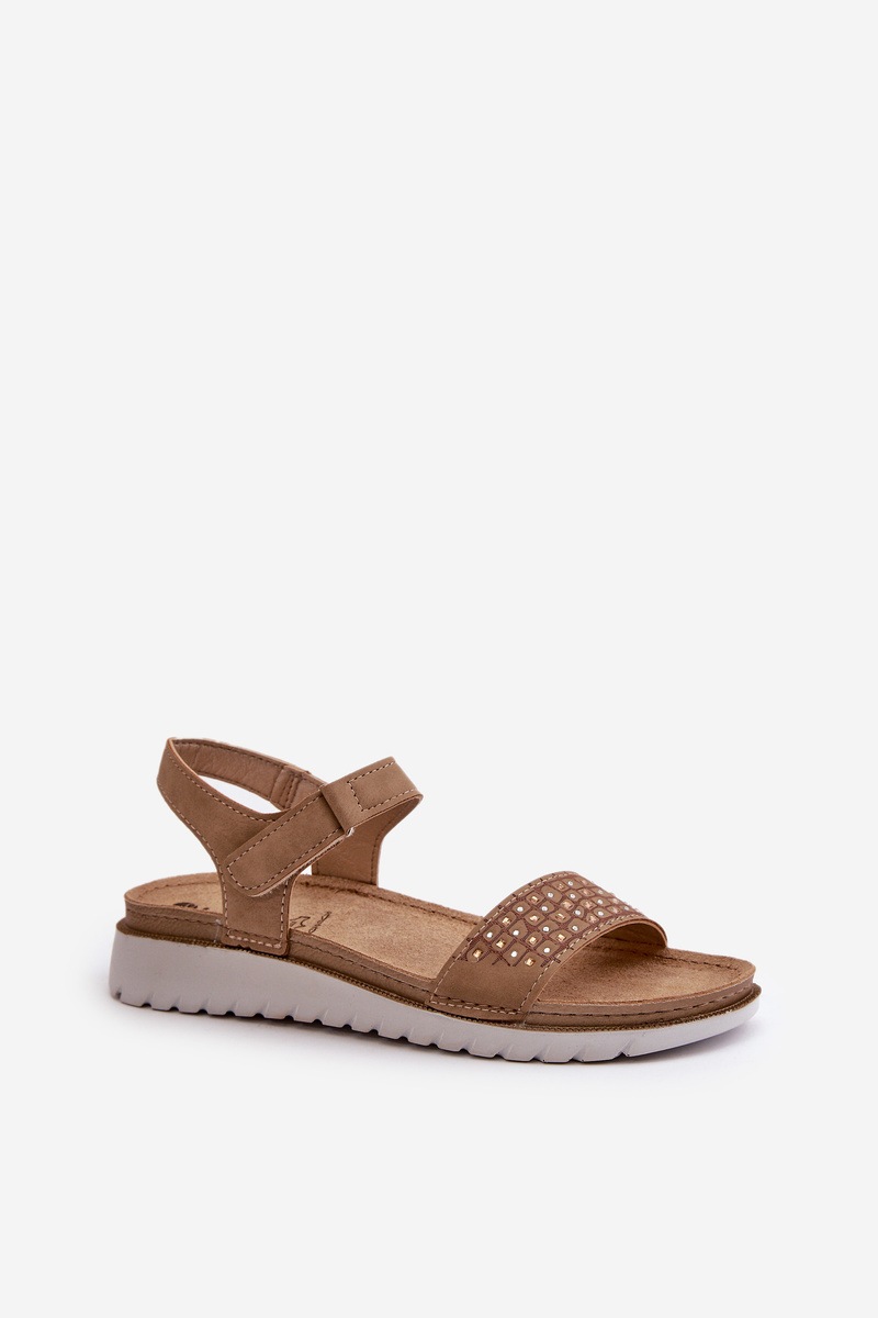 Zdobione Sandały Damskie Na Rzep Lekkie I Wygodne Ciemnobeżowe Inblu CN000039